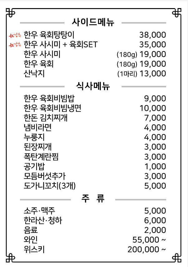 • 한우육회물회(2인): 19,000원