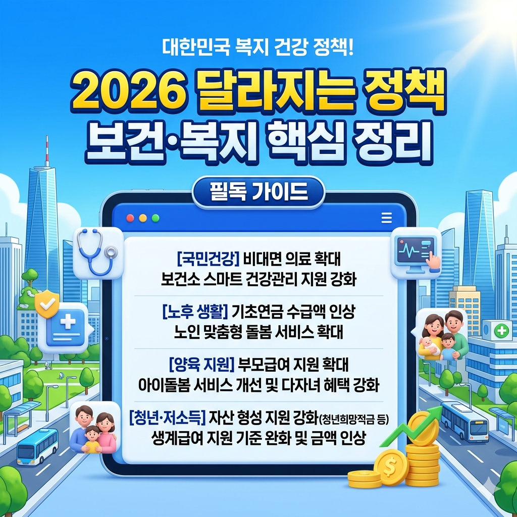 2026년 시행될 보건·복지 정책들은 고령화와 저출산이라는 사회적 과제에 대응하기 위해 맞춤형 복지 서비스를 강화하는 데 초점을 맞추고 있습니다. 본인이나 가족이 해당되는 구체적인 자격 조건과 신청 방법을 미리 확인하여 정부의 지원 혜택을 놓치지 마시기 바랍니다.