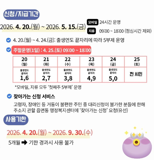 순천시 민생회복지원금 신청은 2026년 4월 20일(월)부터 5월 15일(금)까지 진행됩니다. 신청 초기 혼잡을 방지하기 위해 첫 주에는 출생연도 끝자리에 따른 요일제(5부제)를 시행합니다.
