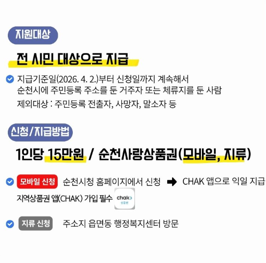 지원금은 지역 경제 활성화를 위해 순천사랑상품권으로 지급되며, 주소지 관할 읍·면·동 행정복지센터를 직접 방문하여 신청할 수 있습니다.