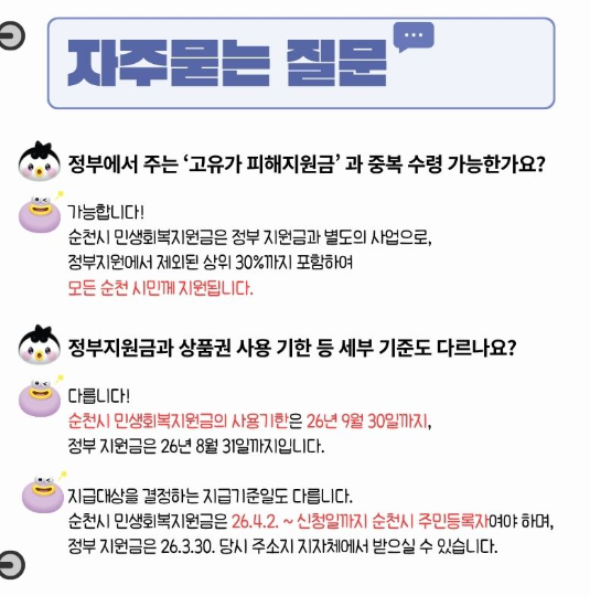 가장 큰 특징은 정부 지원금과 중복 수혜가 가능하다는 점입니다. 정부에서 추진하는 민생회복지원금과 순천시 자체 지원금을 모두 받을 수 있어 시민들의 가계 부담을 실질적으로 덜어줄 것으로 기대됩니다.