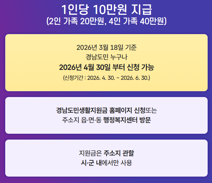 이번 지원금은 전액 경남도비로 충당되며, 2026년 4월 도의회 심의를 거쳐 최종 확정된 후 5월부터 지급이 시작됩니다.